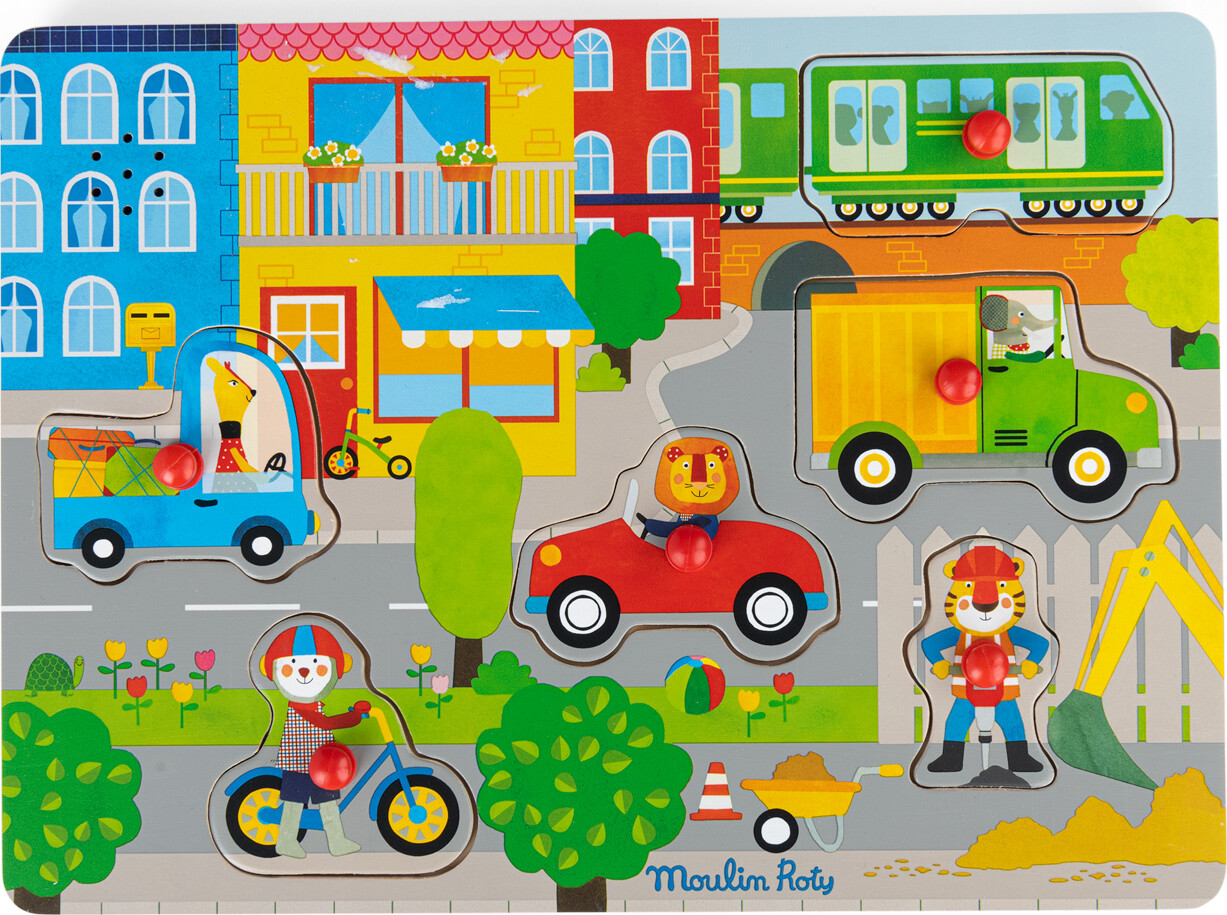 Moulin Roty - Knoppuslespil Med Lyd 6 Brikker - Byen - Les Popipop