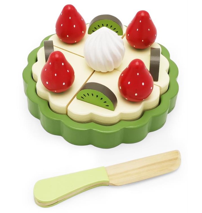 Fin legekage af træ, der kan skæres i stykker. Dit barn kan pynte med jordbær eller kiwi.Indhold: KagefadKage med 4 stykker, sat sammen med velcro4 jordbær4 kiwier1 kageknivFlødeskumsdut til midten