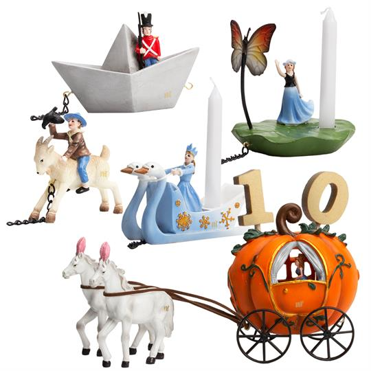 Flotte, massive figurer fra de mest elskede eventyr i en festlig parade til ære for dit dejlige fødselsdagsbarn - kan det blive bedre?Lad Tommelise, Askepot, Snedronningen, Klodshans og Tinsoldaten pynte bordet til festen. Når du lader de klassiske fortællinger spille en aktiv rolle i dit barns liv, vil fortællingerne blive en del af dit barns barndom.Og der er vist ikke noget dårligt at sige om at have styr på sine klassikere, når det kommer til eventyrlige fortællinger.Eventyrtoget er af resin, og der medfølger 19 udskiftelige tal. Der er plads til et levende eller batteridrevet lys på Tommelises åkandeblad og i Snedronningens kane, og på taget af Askepots vegetariske karat kan der stå 2 tal.