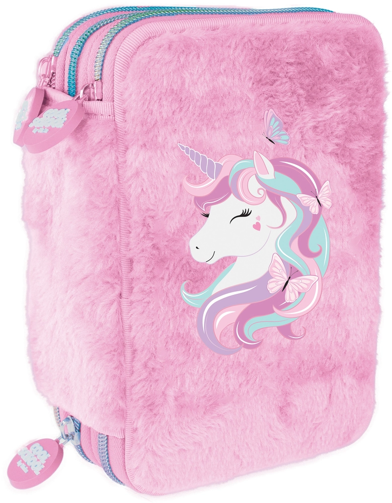 Penalhus Unicorn rosa i Plys fra Cool School by Tinka med 3 lynlåse og indhold. I penalhuset finder du 18 tuscher, 9 tynde farveblyanter, 9 tykke farveblyanter, 1 trylleblyant, 1 begynderblyant, 1 almindelig blyant, samt lineal, saks, limstift, viskelæder