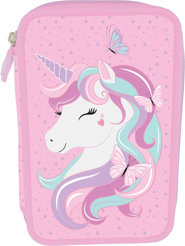 Penalhus Unicorn rosa fra Cool School by Tinka med 2 lynlåse og indhold. I penalhuset finder du 9 tynde farveblyanter, 9 tykke farveblyanter, 1 trylleblyant, 1 begynderblyant, 1 almindelig blyant, samt lineal, saks, limstift, viskelæder og dobbelt blyants
