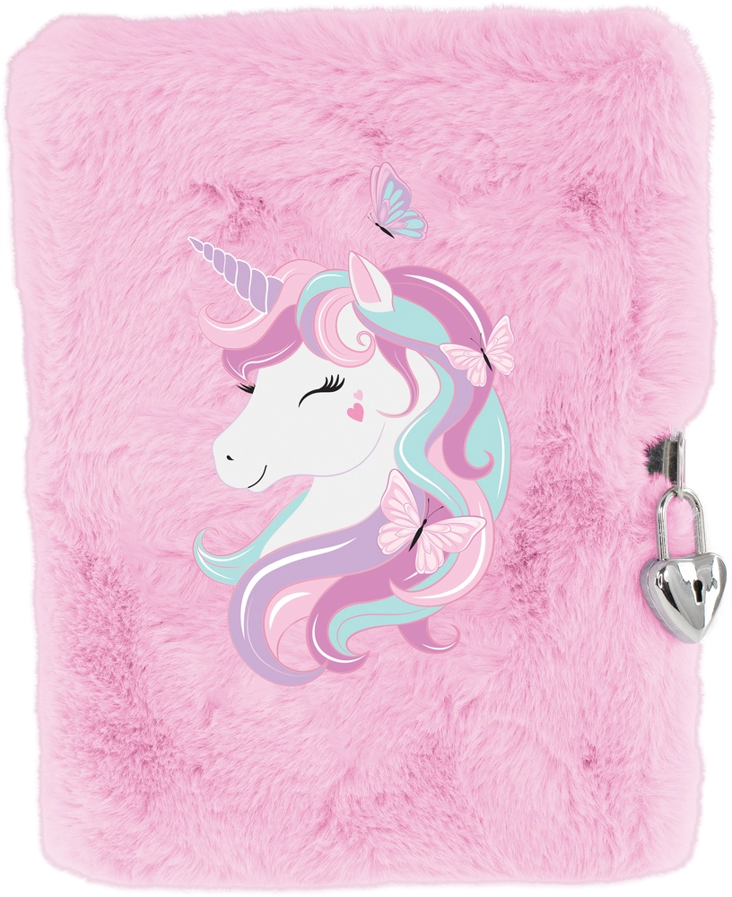Dagbog fra Cool School by Tinka med rosa Unicorn motiv og blødt plysomslag. Dagbogen kommer med lås og tilhørende nøgler formet som et hjerte.