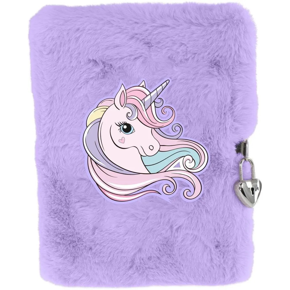 Dagbog fra Cool School by Tinka med lilla Unicorn motiv og blødt plysomslag. Dagbogen kommer med lås og tilhørende nøgler formet som et hjerte.