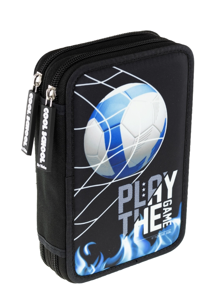 Penalhus Fodbold "Play the Game" fra Cool School by Tinka med 2 lynlåse og indhold. I penalhuset finder du 9 tynde farveblyanter, 9 tykke farveblyanter, 1 trylleblyant, 1 begynderblyant, 1 almindelig blyant, samt lineal, saks, limstift, viskelæder og dobb