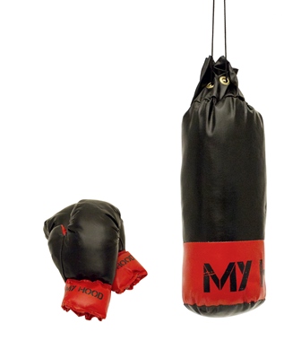 Så kan de små lege boksetræning og øve deres hånd øje koordination, når de skal ramme boksesækken, der svinger frem og tilbage.Boksesækken har 4 sejldugsringe foroven til ophæng. Der medfølger en snor, som du kan binde gennem to eller 4 af ringene og op omkring fx en stolpe.Boksesækken er let og anbefales derfor til mindre børn: 3-5 årHandskerne er ligeledes små og passer også bedst til de 3-5 årige.Vægt: 1 kg.Har du større børn, så kig på et af de andre boksesæt i denne kategori - vi har dem nemlig i flere størrelser.