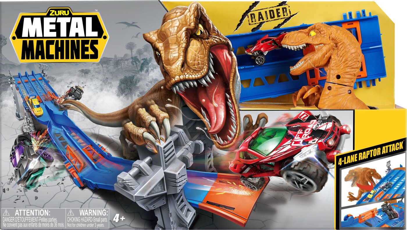 Elsker du biler? Elsker du dinosaurer? Så er det her simpelthen det mest perfekte produkt nogensinde!  Slip Raider og dine andre Metal Machines biler løs i dette legesæt og se den seje action...