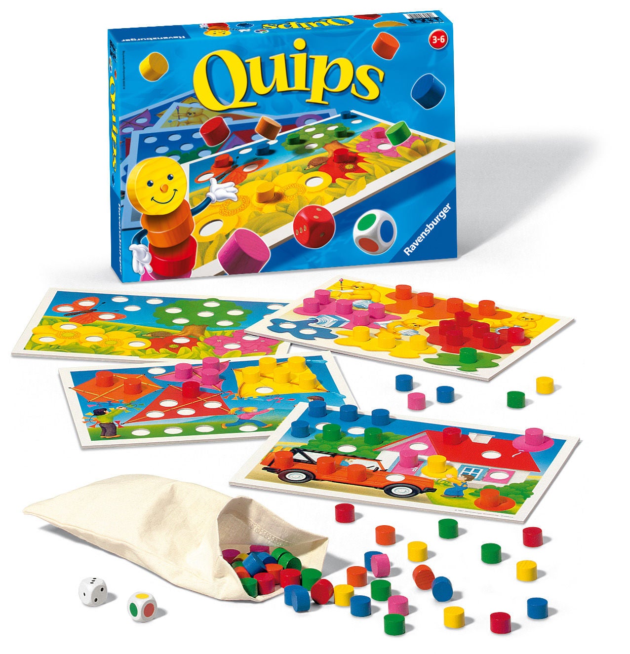 Quips er et underholdende selskabsspil, hvor spillerne skal fuldende billeder ved at kaste terningen. Spillet er en sjov måde for børn at lære farver og tal. Anbefalet alder: Fra 3 til 6 år.