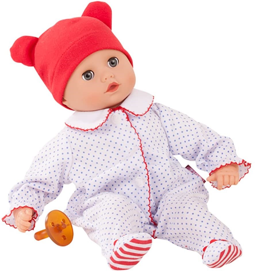 Arme, ben og hoved er af vinyl. Kroppen er dejlig blød og rar at kramme og har indhold af blød bomuld. Uden anatomisk køn.Götz dukkernes tøj er af økologisk bomuld, og denne dukke kommer med heldragt med fødder i og har også med en sut, der trøster, når dukken er ked af det.De trætte øjne lukker, når dukken ligger ned.Dukken er oplagt til rolleleg, der styrker dit barns empati og sociale kompetencer. Som en skøn detalje kan du skånevaske dukken og dukketøjet i vaskemaskinen. Det er rigtig rart, når dukken forhåbentlig er blevet dit barns bedste ven og bliver slæbt med alle steder, bliver tabt fra cykelstolen og tager en tur fra rutsjebanen ned i det våde grus.