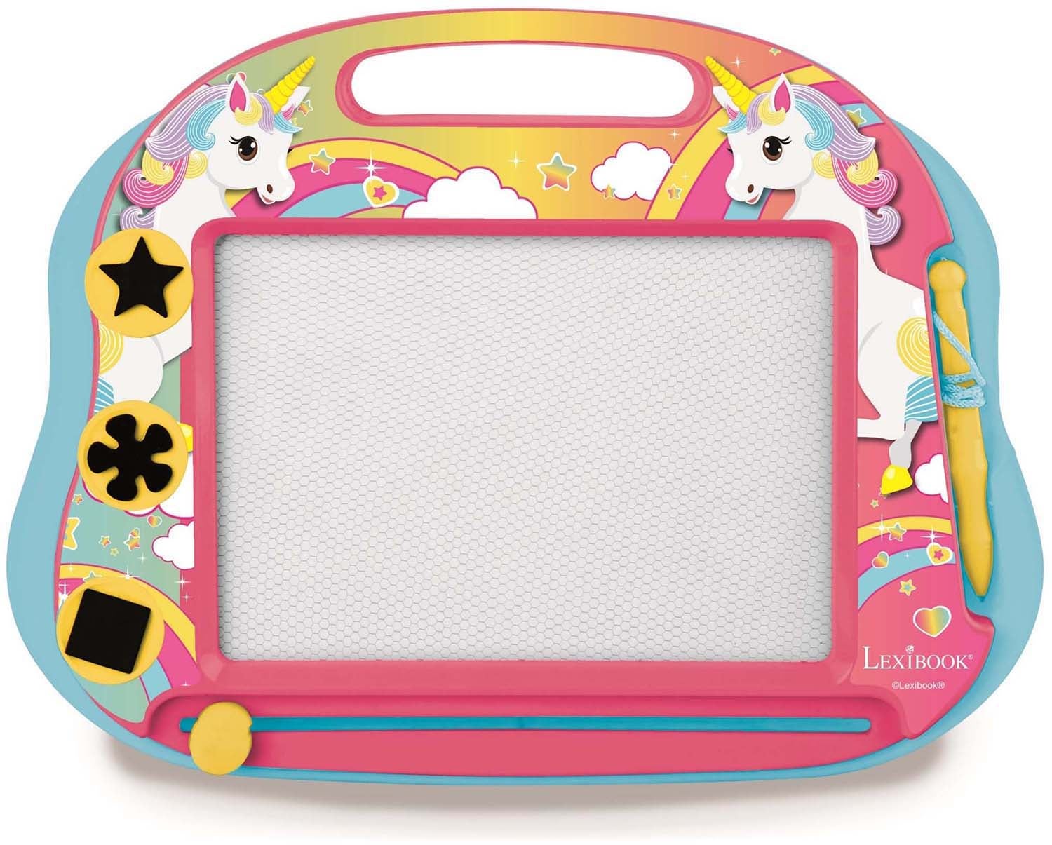 Magnetisk Unicorn tegnetavle fra Lexibook der er perfekt til kreative børn med et håndtag. Den har en magnetisk blyant og tre magnetiske stempler. CE-mærket Ikke egnet til børn under 3 år Anbefalet alder: Fra 3 år