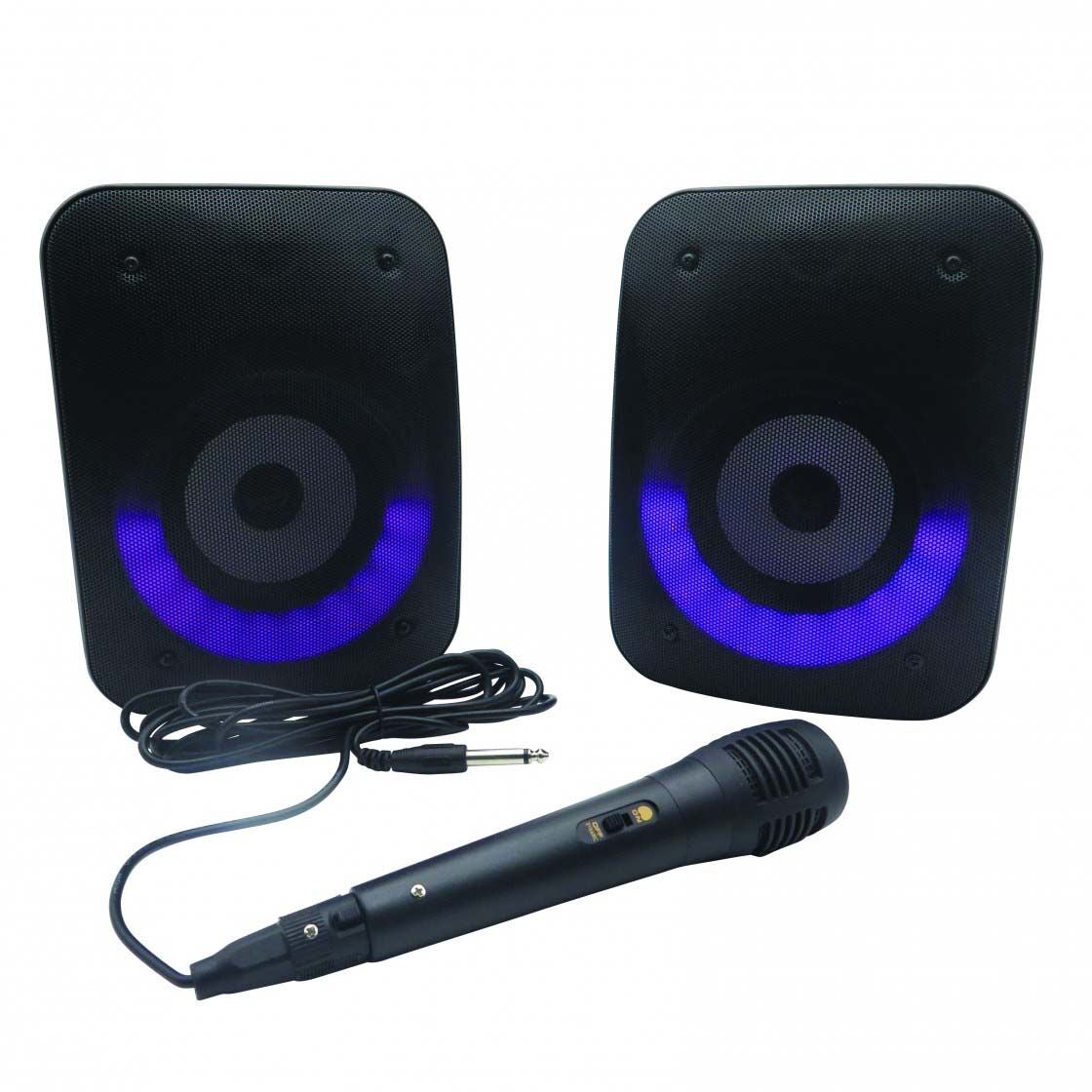 To Iparty højtalere fra Lexibook med Bluetooth. De har en medfølgende mikrofon og seje lyseffekter. Batteritid: ca. 3 timer. USB oplader medfølger. Anbefalet alder: Fra 6 år. Litiumbatteri medfølger.