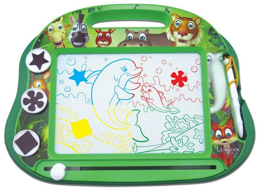 Magnetisk tegnetavle fra Lexibook med et indbydende dyretema. Den har en magnetisk pen og tre magnetiske stempler med en stjerne, en blomst og en firkant. Tegn eller skriv med medfølgende pen og stempler, oghvis du vil starte forfra, skal du bare bruge viskelæderet. Perfekt til timevis af kreativ leg. Indeholder: 1 tegnetavle, 1 magnetisk pen, 3 magnetiske stempler. CE-mærket. Anbefalet alder: Fra 3 år.