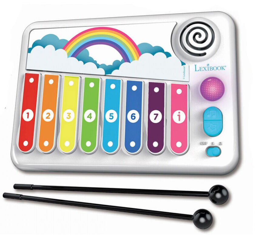 XYLO-FUN xylofon fra Lexibook med lyseffekter, der skifter farve og guider mod den næste tone, der skal spilles for lettere indlæring. Perfekt til nybegynderen. 2 tilgængelige tonelejer. 6 inkluderede demosange. 8 inkluderede melodier. CE-mærket. Anbefalet alder: Fra 3 år. Batterier medfølger.