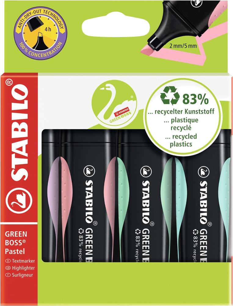 Med de 4 pastelfarver giver STABILO GREEN BOSS Pastel highlighterene dig mulighed for at fremhæve, understrege og lægge vægt på dit arbejde. Fremstillet af 83% genbrugsplast med et stilfuldt design. Skab langtidsholdbare smukke noter i skolen, på universi