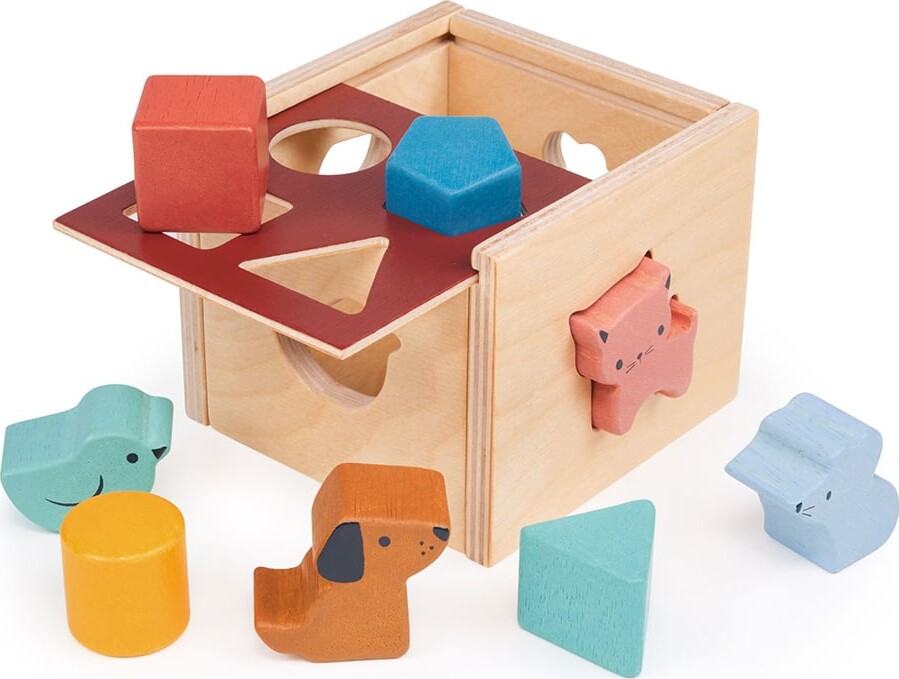 Superfin puttekasse til dit barn. En trękasse med udskårne former på alle 4 sider. Låget er aftageligt og har 4 udskårne former. Der medfųlger 4 dyr i massivt trę og 4 klassiske 3-dimensionelle...