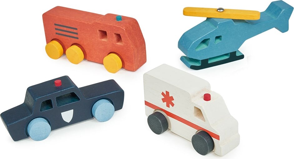 Plastfri, trælegetøjskøretøjer med træhjul og udskårne vinduer. Til alle dine ulykkes- og nødeventyr. Sættet indeholder; helikopter med roterende vinger, ambulance, brandbil, politibil....