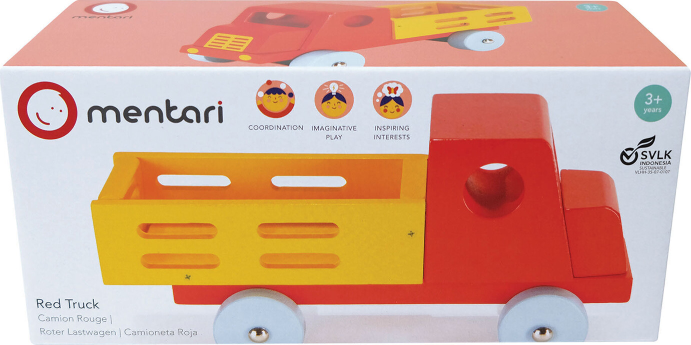 En klassisk rød lastbil med gult lad og lyseblå hjul. Baseret på retrodesign giver de enkle,...