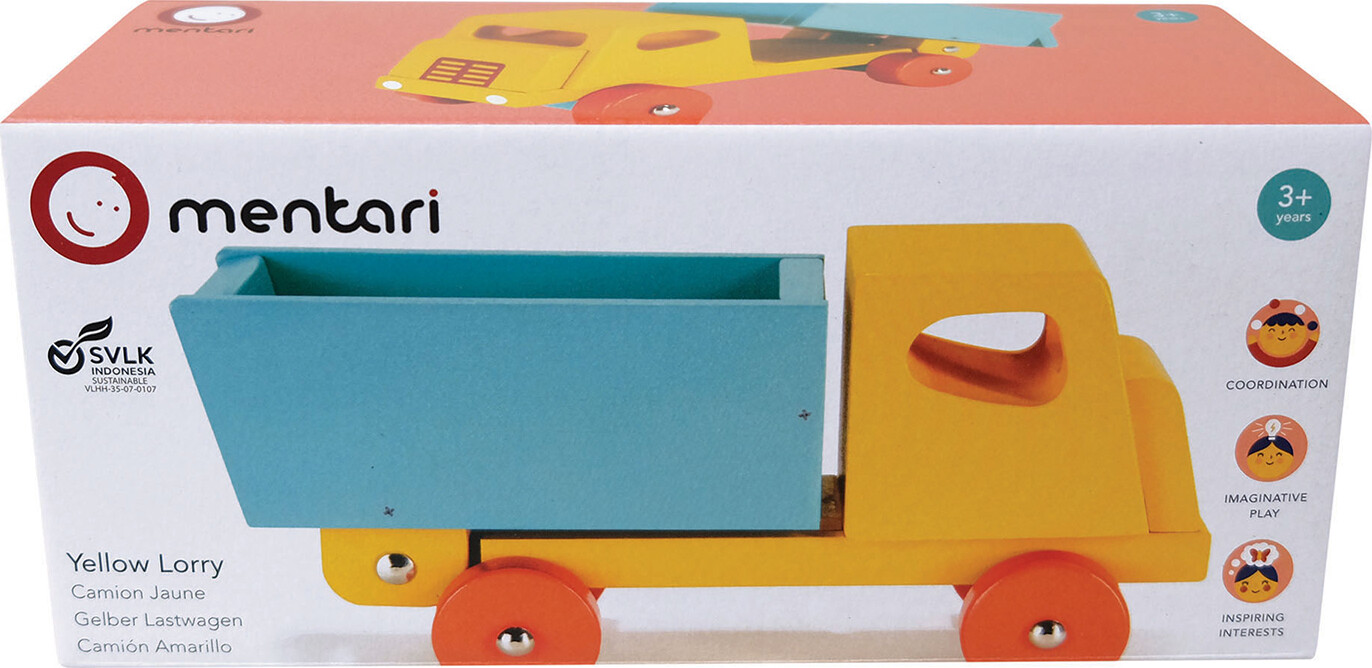 En klassisk gul lastbil med tiplad og orange hjul. Baseret på retrodesign giver de enkle,...