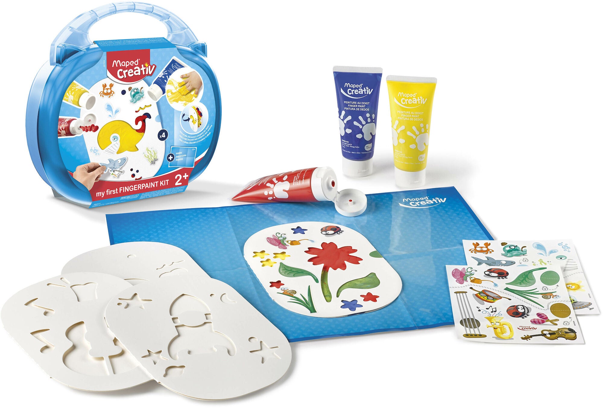 Creativ fingermalingssæt fra Maped med medfølgende tilbehør. Perfekt til mange timers kreativ leg og kunsthåndværk. 3 forskellige farver. Skabeloner. Klistermærker. CE-mærket. Anbefalet alder: Fra 2 år.