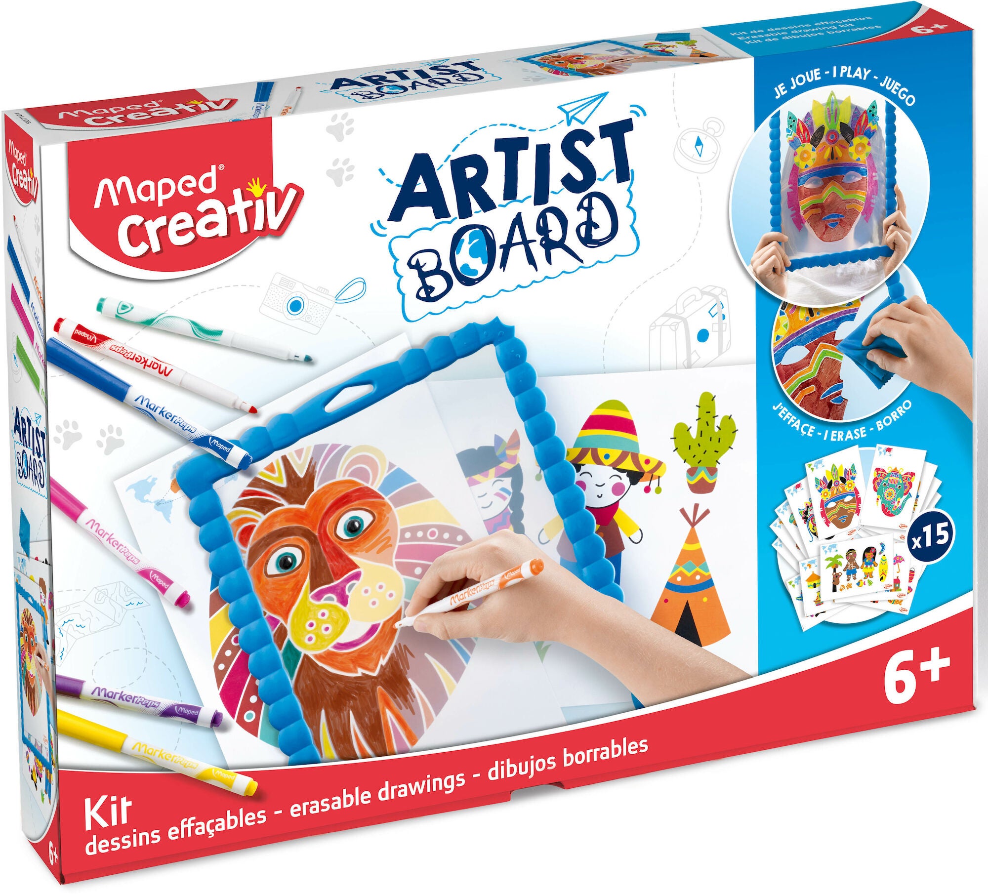 Creativ tegnetavle fra Maped med en transparent ramme. Den har 15 trykte kort og 10 filttusser. Den gennemsigtige ramme giver dig uendelige muligheder for at tegne efter billeder bag plastikoverfladen. Læg et af de medfølgende korttryk under plasten og farvelæg med tus. Når du er klar til at lave det næste mesterværk, visker du let tegningen ud med den medfølgende klud. Indeholder: 15 trykte kort, 10 tusser, 1 ramme, 1 udvisker. CE-mærket. Anbefalet alder: Fra 6 år.