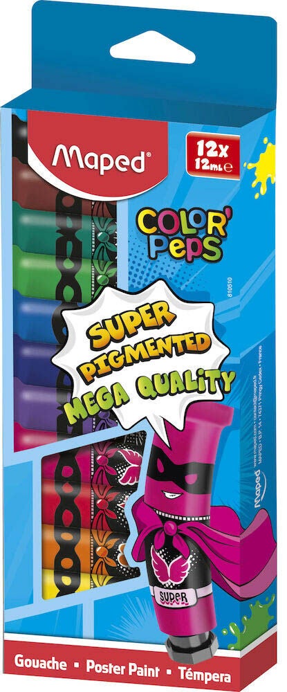 Ti farverige gouachefarver fra Maped. Hver tube indeholder 12 ml farve. Perfekte til at bringe dit barns kreativitet frem. 12 ml. 10-pak. CE-mærket. Anbefalet alder: Fra 4 år.
