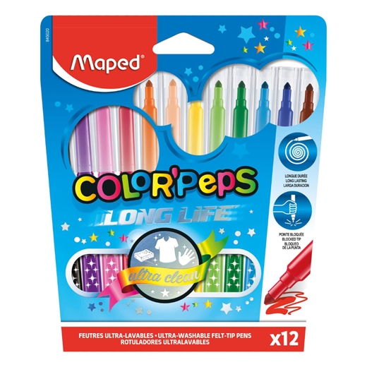 Maped Tusser Color Peps 12 stk. Maped Tusser Color Peps 12 stk. er flotte tuscher til mange timers hygge med farvelægning. Pakken indeholder 12 farver i medium tykkelse. De kan nemt vaskes af med sæbevand, når barnet kommer til at tegne udenfor papiret.