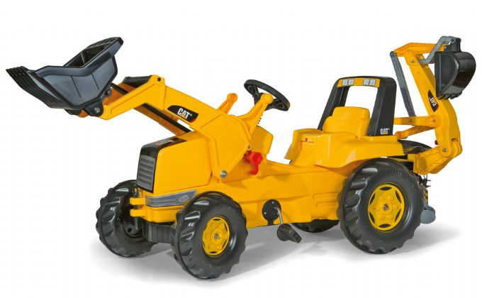 Traktorens kølerhjelm kan åbnes. Med beskyttet kæde, lydsvage dæk og justerbar sæde. Mål: 164,5 x 53 x 76 cm Rolly Toys pedaltraktor med gravearm med låsemekanisme og frontskovl der kan tippes med håndtag. Vægt: 13 kg. Fra 3 - 8 år.