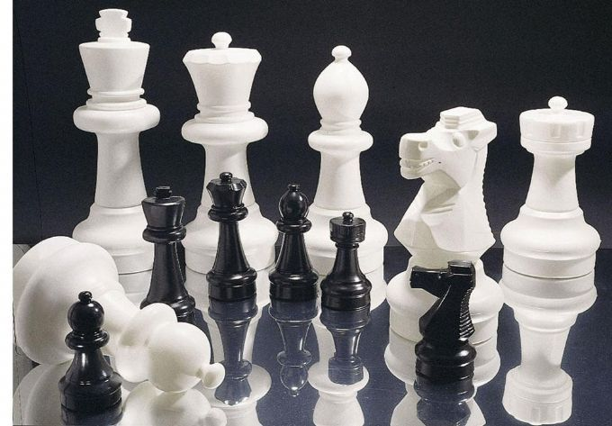 Små Skak figurer - Komplet sæt..Højde på figurer: Konge: 30cm Dame: 29cm Løber: 26cm Hest: 21cm Tårn: 21cm Bonde: 20cm