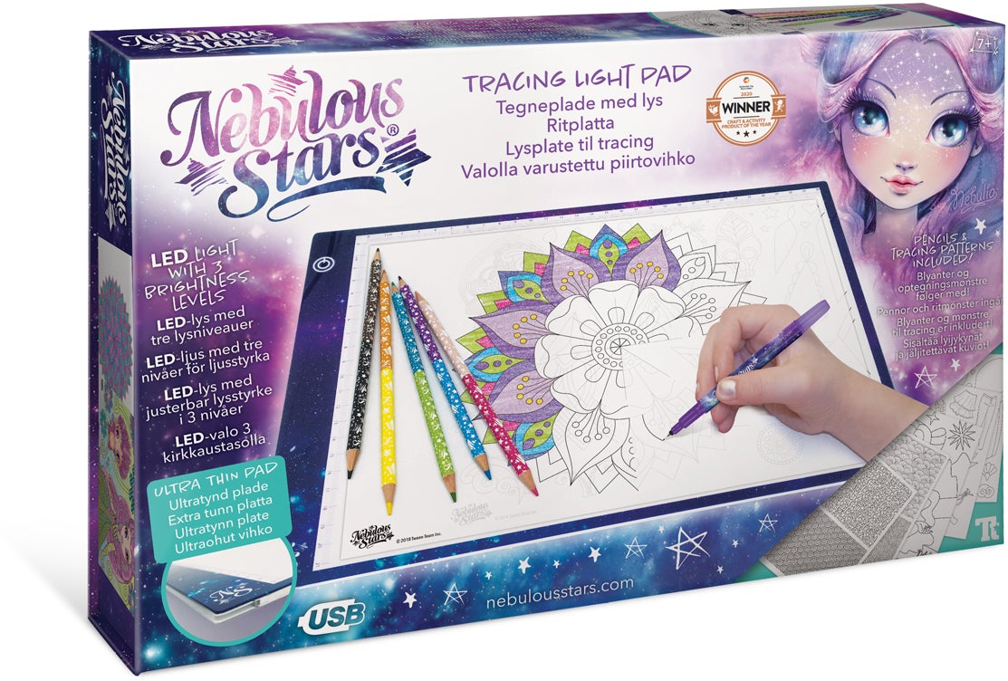 Sjov tegnetablet fra Nebulous Stars med en masse tilbehør til kalkering, kalligrafi, design og tegning. Perfekt til kreative stunder. - Indeholder: 1 tegnetablet, 5 farveblyanter med spids i begge ender, 1 tegnepen, 10 mønsterark, 1 sæt med mønstersider, 1 USB-kabel. - Indeholder Nebulas historie. - Ekstra tynd plade. - Justerbar lysstyrke. - Jævn, meget lys og flimmerfri belysning. - Let at tage med på farten. - USB-oplader medfølger ikke. - CE-mærket. - Anbefalet alder: Fra 7 år. - Papir, plastik.