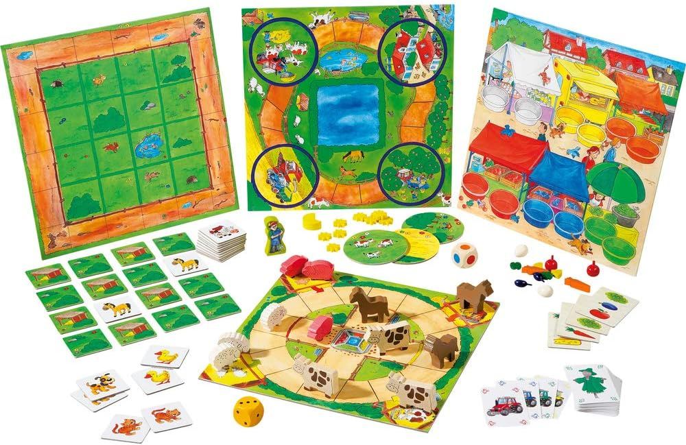 HABA's store spilsamling med 10 spil, velegnet til de mindste spillefugle fra 3 år, samler de mest populære bræt-, memo- og terningespil. Hvem hjælper bonde Bert bedst?Hvem køber de lækreste frugter på markedet?Og hvem ved, hvor de frække dyr på marken har gemt sig?10 spil-idéer med simple regler og kort spilletid giver en vellykket indføring i spillets verden. Velkendte spilklassikere er blevet tilpasset til børn og forenklet, så selv de yngste kan have det sjovt med at spille.Tiden flyver forbi med klassiske, samarbejdende og spændende bræt-, hukommelses- og kortspil. Når alle spillene er samlet i samme kasse, er det altid nemt at tage det hele med på tur i sommerhuset, hvor der måske venter en regnvejrsdag eller to.Indhold:3 heste, 3 køer, 3 grise, 3 får, 2 røde æbler, 2 blommer, 2 æg, 2 ostestykker, 2 salathoveder, 2 gulerødder, 1 bonde, 2 terninger, 9 stjerner, 1 måne, 2 dobbeltsidet trykte spilleplader, 32 spillekort, 32 hukommelseskort, 4 indkøbssedler, 3 hjul, 1 spillevejledning.Charmerende udformet, børnevenligt spilmateriale i træFantastiske hukommelses-, løbe- og farvespil, hvor der er masser at tale om undervejs.Liste over indholdet i spillet gør det nemt at se, hvad der følger med, og hvordan de enkelte spil spilles.Så hvis du leder efter et spil, der er sjovt, lærerigt og kvalitetsorienteret for både børn og voksne, er HABA's store spilsamling - Min første skat af spil et fantastisk valg, der vil bidrage til at skabe dejlige minder sammen med dine børn.