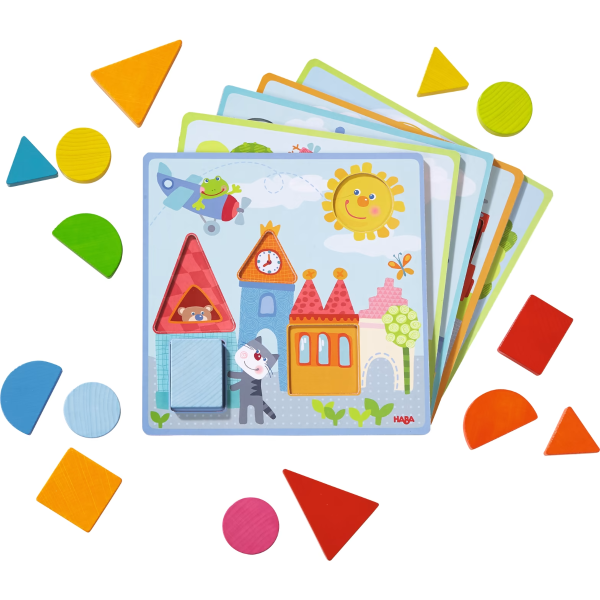 Her lærer dit barn at genkende former og farver, når de 15 træfigurer i geometriske former skal placeres rigtigt på de 5 kort med fordybninger til figurerne.