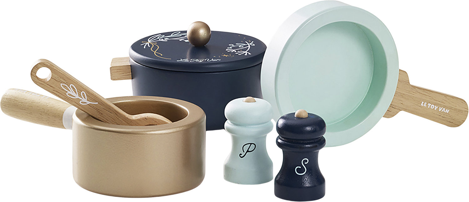 Gryder & pander: Til de små kokkespirer så er der her det helt perfekte grydesæt i træ.Sættet indeholder føgende: 1 x kasserolle med låg, 1 x wok, 1 x grill stegepande, 1 x grydeske samt salt og perber sæt.Emballage:16 x 24 x 12 cmAlder: 2-5 år