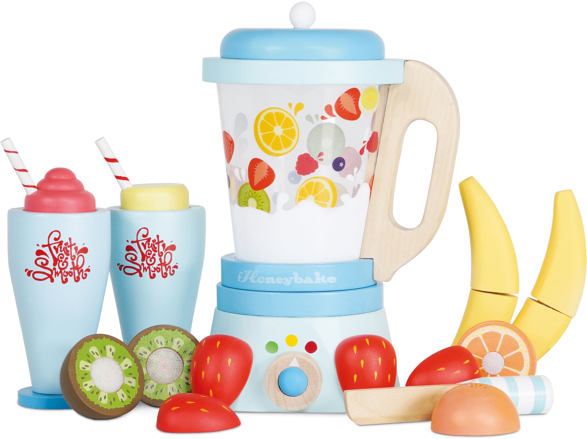 Smoothie-blendersæt fra Le Toy Van med en realistisk funktion, som dit barn kan udforske. Perfekt til timevis af fantasifuld leg. - Indeholder: 1 blender, 2 smoothies, 1 legetøjskniv, 6 frugter. - Lav dine egne smoothies! - Holdes sammen med velcro, så de adskilles realistisk, når de skæres i skiver. - Udvikler kognitive og finmotoriske færdigheder. - Let at rengøre med en fugtig klud. - CE-mærket. - Anbefalet alder: Fra 3 år. - Tetræ, MDF, krydsfiner, velcro.