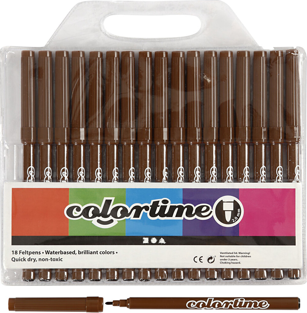 Sæt kunstværket i gang med 18 vandbaserede brune tuscher af høj kvalitet fra Colortime. Tuscherne er semidækkende og har et ventileret sikkerhedslåg, der gør det sværere for dem at tørre ud. ...