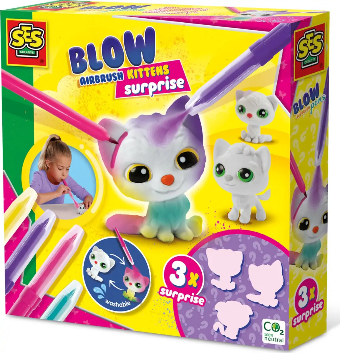 Tre overraskelser venter på at blive fundet. Find killingerne med deres bløde hvide pels. Med de fire farvede airbrush penne kan du give hver hvalp muntre farver, prikker og striber. Færdig? Vask...