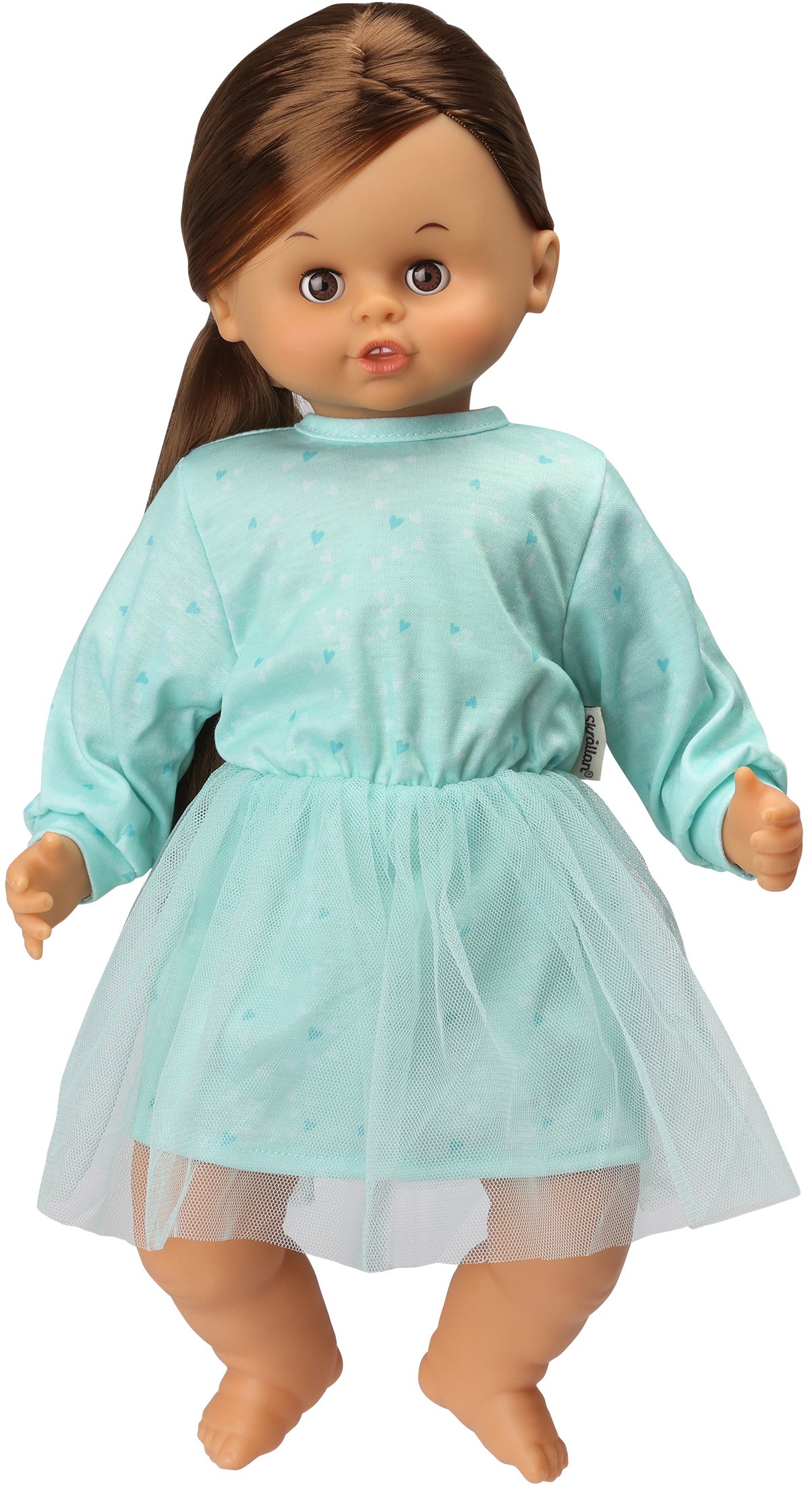 Fin taledukke fra Skrållan med en turkis kjole. Perfekt til timevis af fantasifuld leg. - Taleknap. - 24 forskellige fraser, der opfordrer til leg. - Kan lukke øjnene. - Blød krop. - Taler fem forskellige sprog. - Batterier medfølger. - CE-mærket. - Anbefalet alder: Fra 3 år. - Plastik.