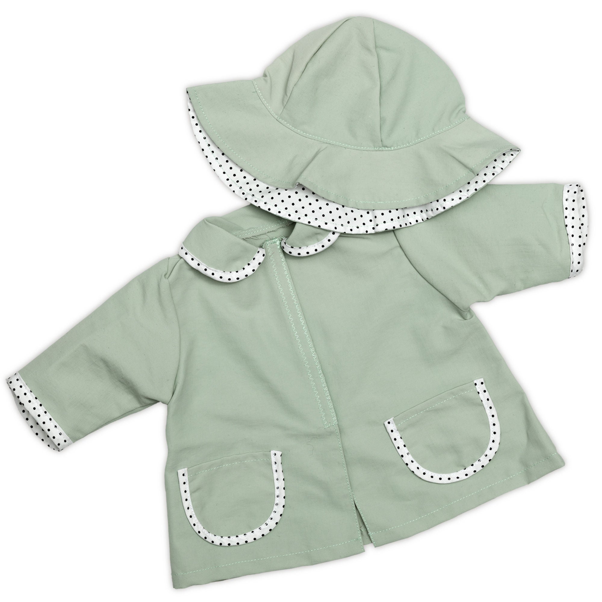 Med denne fine regnjakke og sydvest holder Skrållan sig tør, selvom regnen øser ned. Dukketøjet er vandafvisende og i en flot farve med hvidt for med små, sorte prikker. Det er af høj kvalitet og der findes endda også matchende støvler. Regntøjet passer til dukker, der ca. er 45 cm. Anbefalet alder: Fra 3 år. Materiale: Polyester. Farve: Grøn/Hvid.