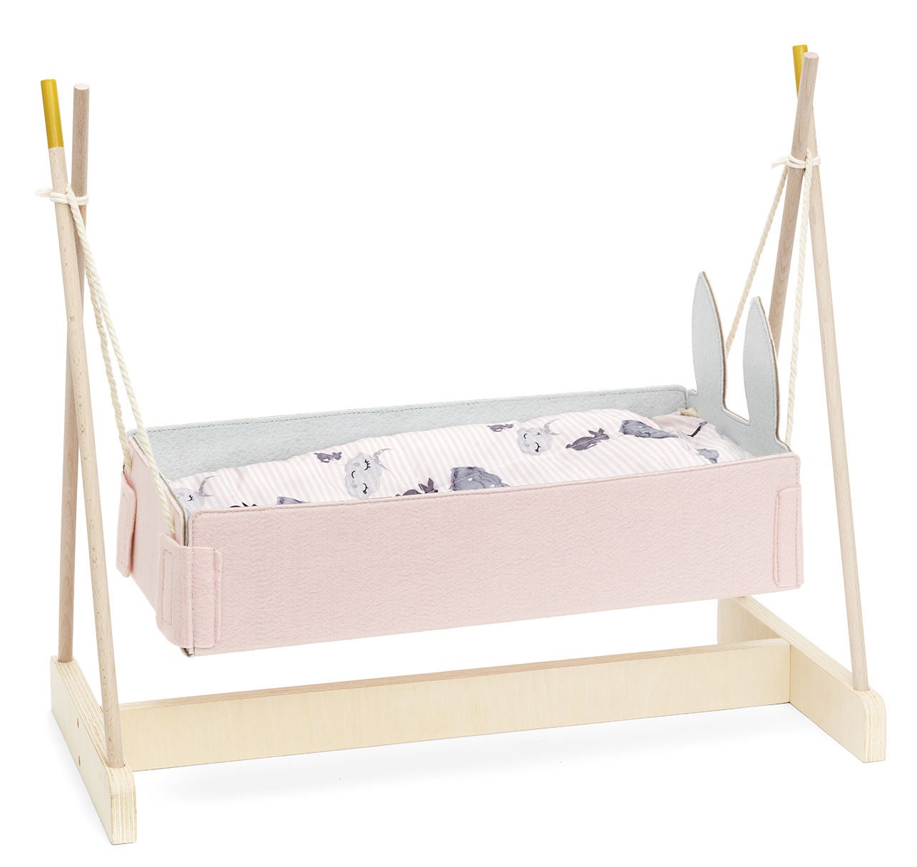 Sød vugge fra Skrållan, der passer til dukker med en længde på op til 45 cm. Vuggen er fremstillet i FCS-certificeret træ og blød filt med små dekorative kaninører i den ene ende. Stativet er fremstillet i træ, men vuggedelen i filt hænges op med reb. OBS! Dukke og sengetøj til vuggen købes separat. Anbefalet alder: Fra 3 år.