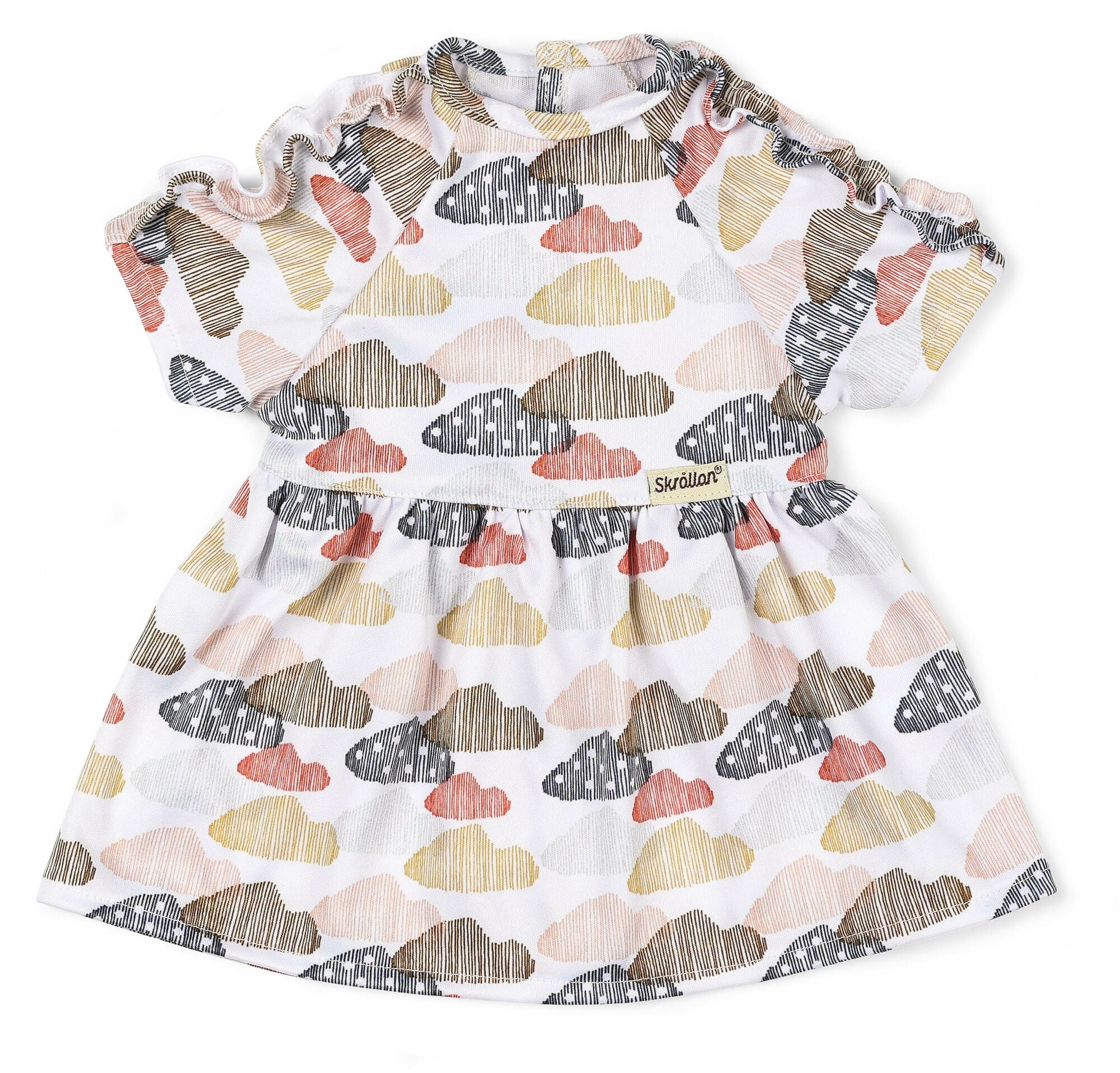 Kjole fra Skrållan med et farverigt skymønster. Den har fine flæsedetaljer og velcrolukning. Perfekt til timevis af fantasifuld leg. Passer til dukker på 45 cm. CE-mærket. Anbefalet alder: Fra 3 år. Polyester.