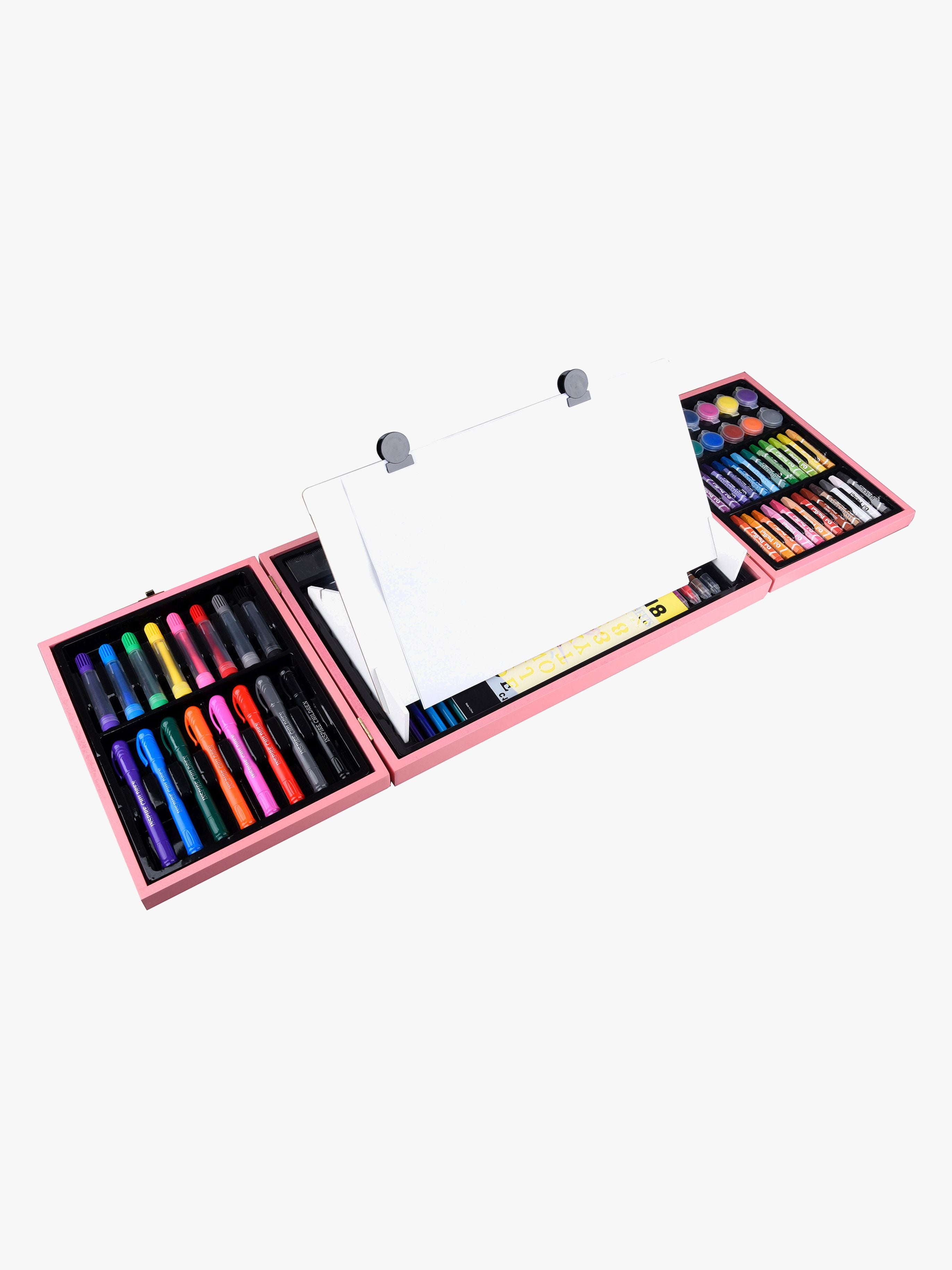Dette Fippla Malesæt Træ produkt er det ideelle valg for kreative børn, der elsker at udfolde deres kunstneriske evner. Med hele 128 dele, herunder 12 vandfarver, 8 farvekridt, 12 farveblyanter, 24 oliepastelfarver, 20 tusser og meget mere, er der rigeligt med materialer til timevis af sjov og læring.