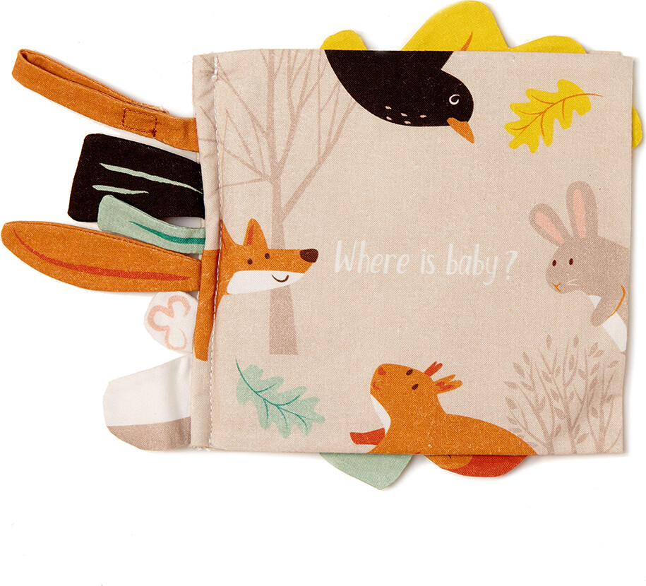 En aktivitetsbog i blødt stof til babyer, hvor hver side har form som et dyr eller blad og vendes...