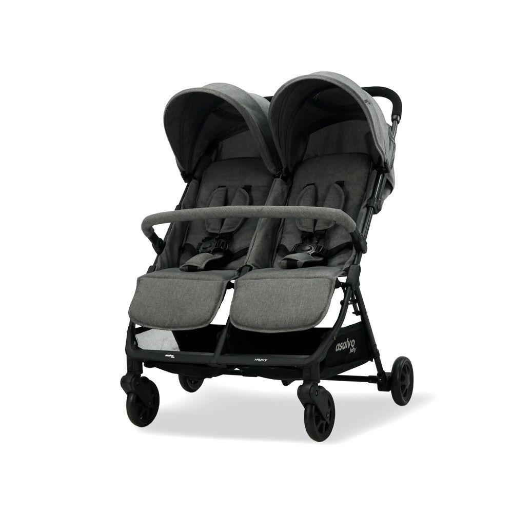 Asalvo tvilling klapvogn Henry, GråTvilling klapvogn med stålstel, et multi-position justerbart ryglæn og 5-punkts sele med skulderpuder for større sikkerhed. Tvillingvognen har drejelige forhjul, en aftagelig frontbøjle, der kan blive på ved sammenfold