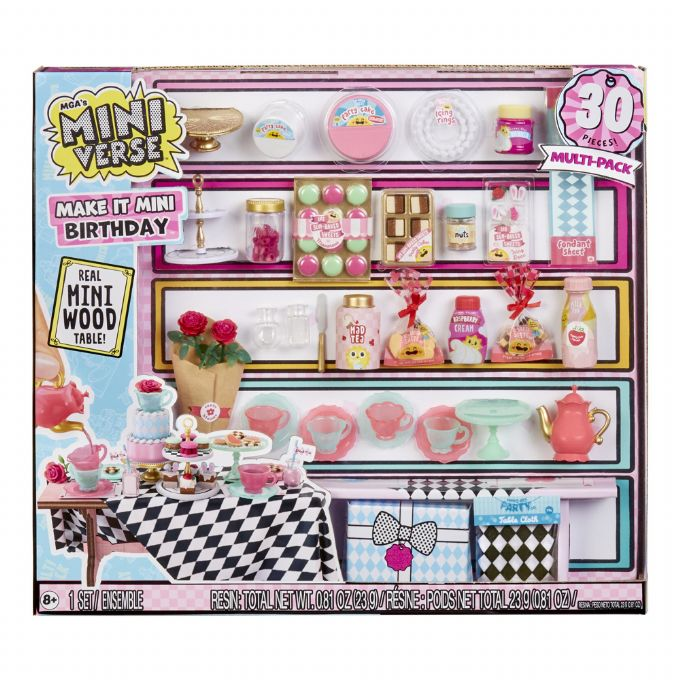 Hold en Miniverse-Megafest med Multipakken med temaet fest og fødselsdag: Emballagen forvandles til en scene for din Miniverse Overraskelsesfest! Halvdelen af genstandene kan ses gennem emballagen, mens den anden halvdel er skjult, så overraskelserne stad