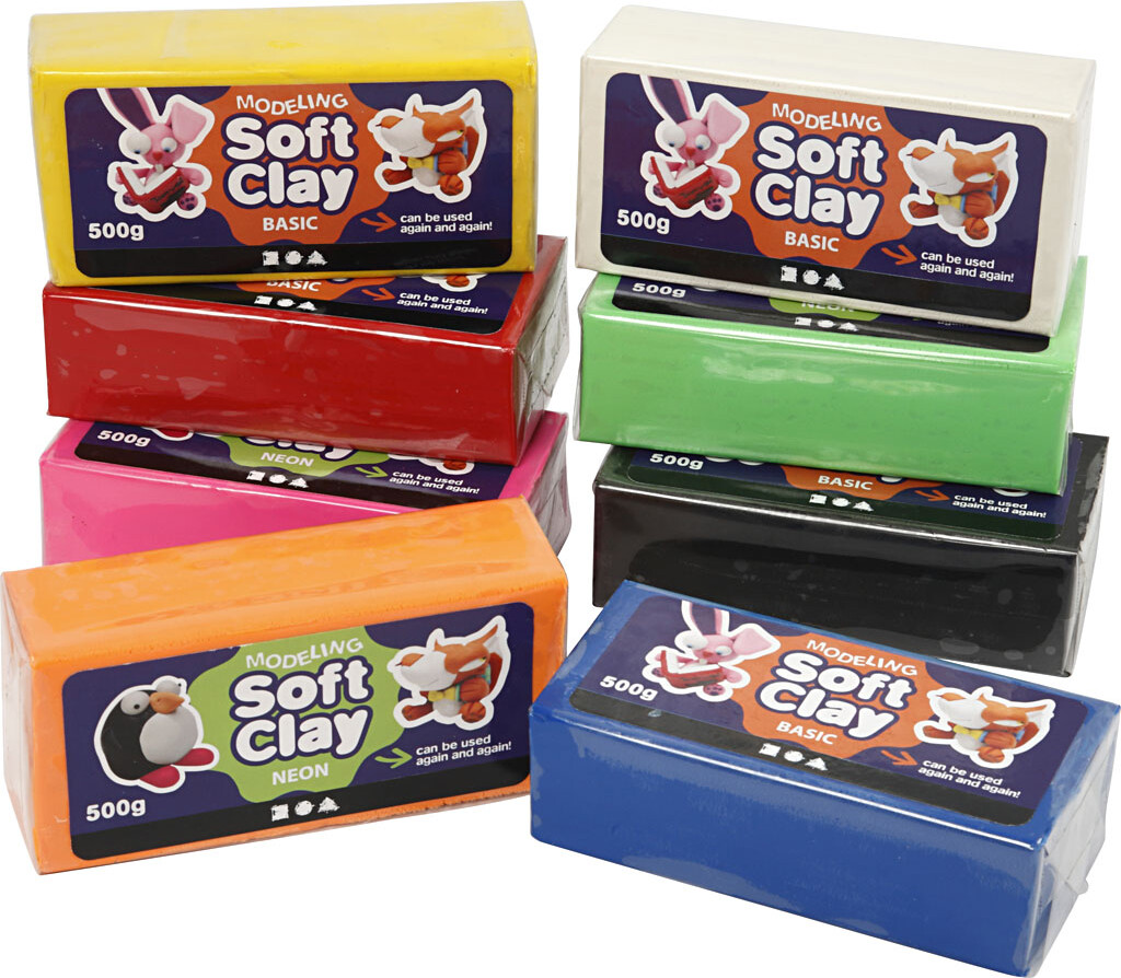 Her får du otte blokke á 500 g med Soft Clay, som er en modellervoks, der har en lækker og smidig kvalitet. Sættet indeholder otte forskellige farver: Rød, gul, orange, sort, hvid, blå, neon...