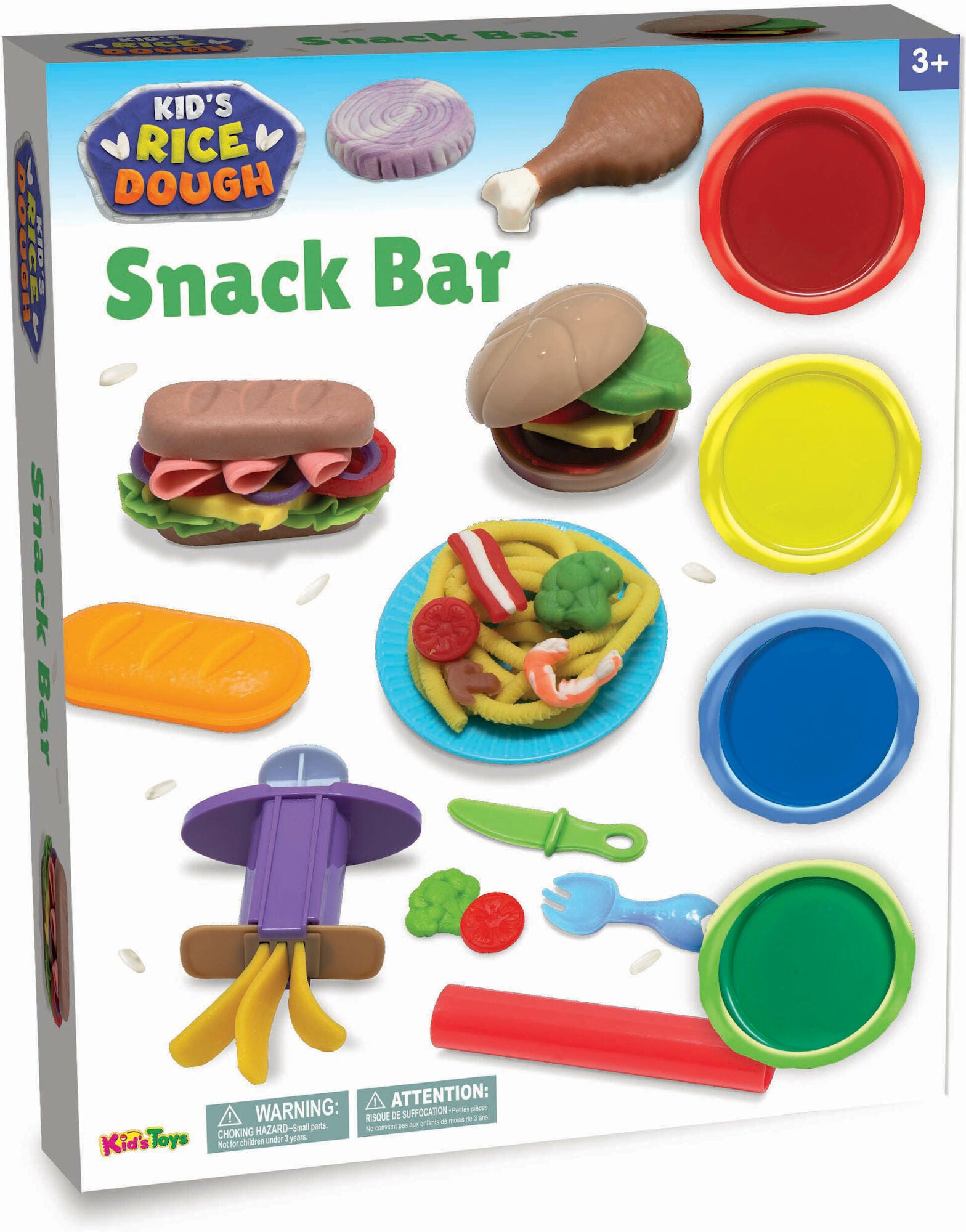 Snack Bar modellervoks fra Kid's Rice Dough med fire beholdere med modellervoks i forskellige farver. Den har sjove redskaber så dit barn kan skabe sine egne former og figurer. Perfekt til kreative aktiviteter. CE-mærket. Modellervoksen er baseret på ris og er glutenfri. Anbefalet alder: Fra 3 år.