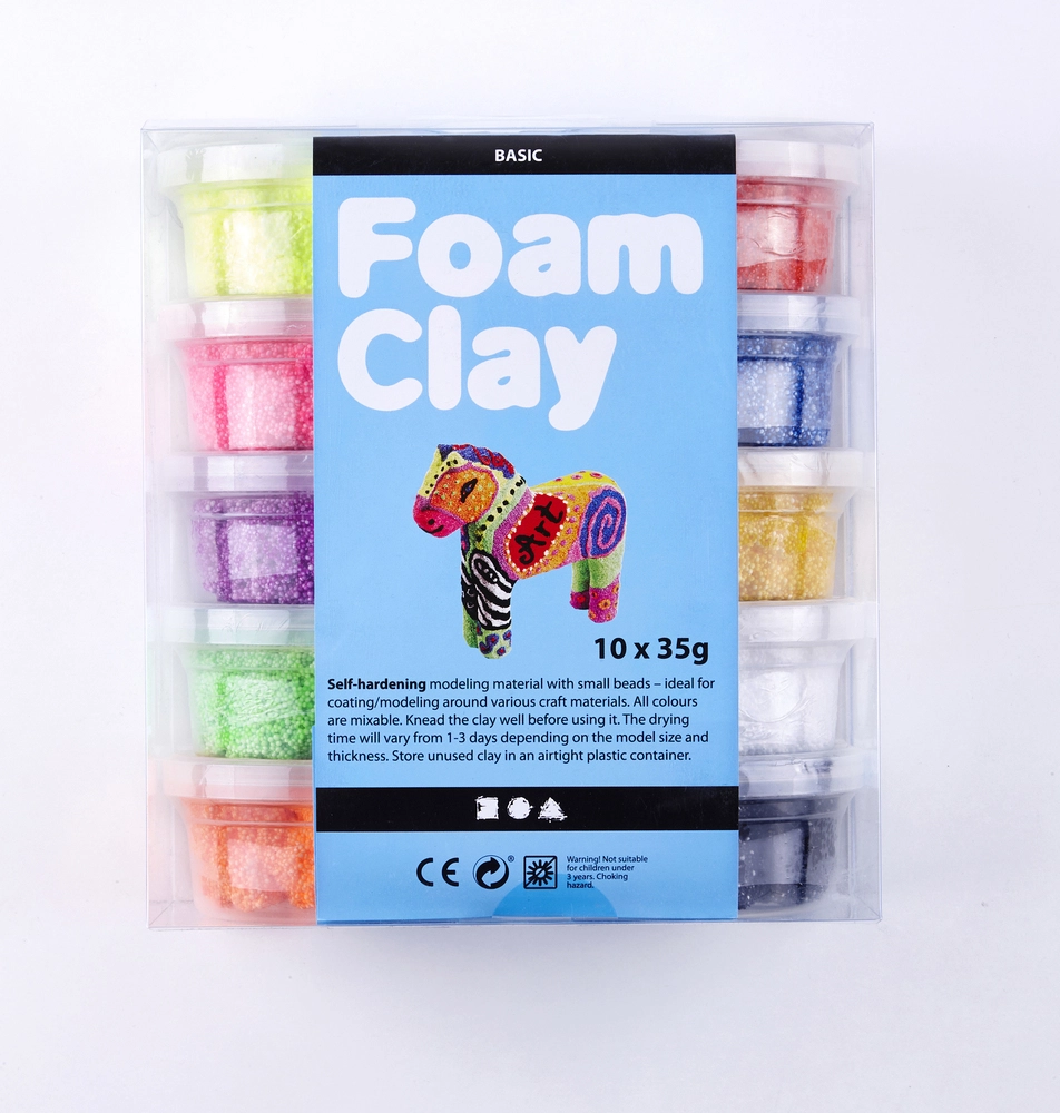 Foam ClaySortiment med selvhærdende modelleringsmateriale med små perler. Er ideel til beklædning/modellering omkring div. emner.Leveres i praktiske dåser og skal opbevares i lufttæt emballage efter åbning. Indeholder 10 bøtter.