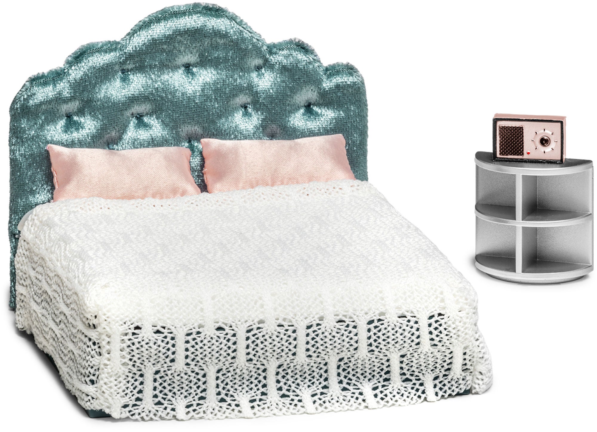 Et fint soveværelsessæt til dukkehuset fra Lundby. Her kan du sige godnat til din dukkehusfamilie og putte dem i seng. I sættet får du en seng med en flot velourgavl, et sengetæppe, en madras og et sengebord med en radio. Helt perfekt til dukkehusfamilien. Anbefalet alder: Fra 4 år.