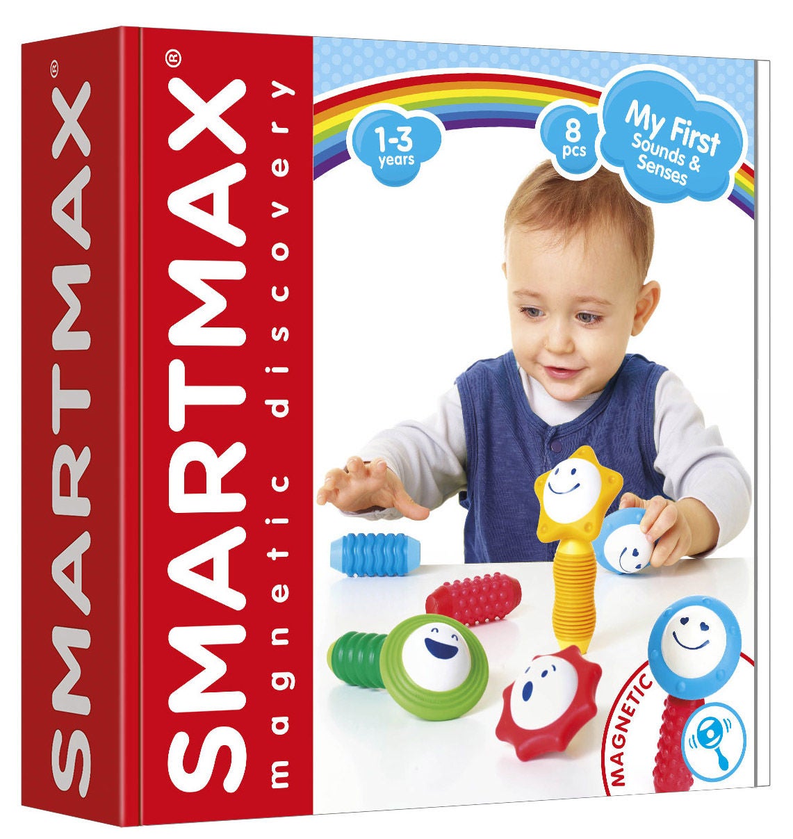 Aktivitetslegetųjet fra Smartmax består af otte magnetiske dele og fire dele med indbyggede rangler. Legetųjets dele har forskellige former og farver og kan kombineres på forskellige måder. Når legetųjet er samlet, kan barnet more sig med at rasle ranglerne og lytte til de forskellige lyde. Anbefalet alder: Fra 1- 3 år.