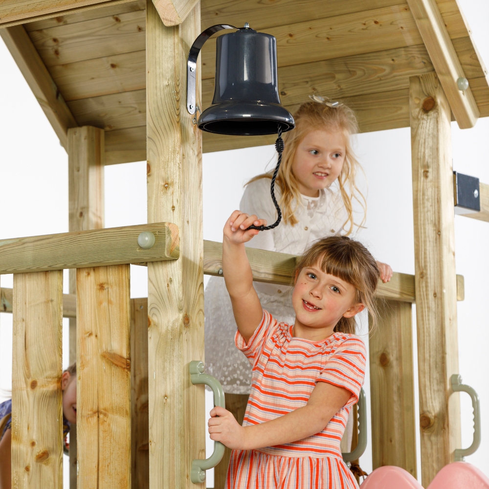Denne store klokke vil gøre sig godt på legehuset eller i baghaven, så du kan ringe til aftensmad for dit barn. Klokken er af plastik, og indeni er der en lille metalklokke, der giver den rigtige lyd.