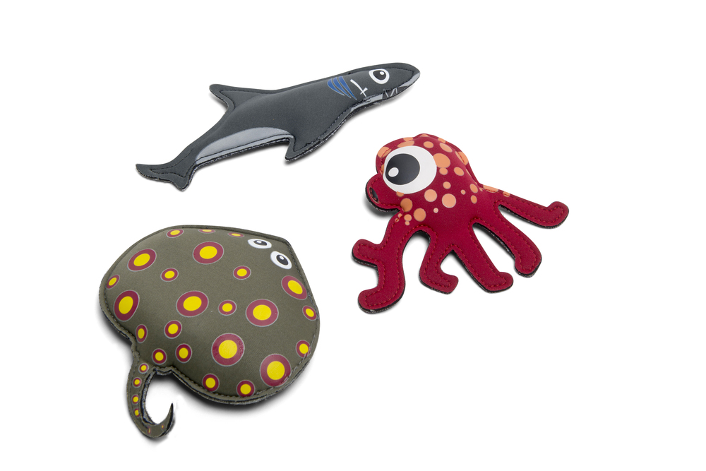 Du kender sikkert de ringe man kan dykke efter i svømmehallerne. Nu kan du få dem i en lidt sjovere udformning nemlig som havdyr. En haj, en rokke og en blæksprutte.I behøver ikke vente til en svømmehalstur for at tage dem i brug. De er også sjove i karbadet eller i havens badebassin, selvom man ikke kan dykke på samme måde.
