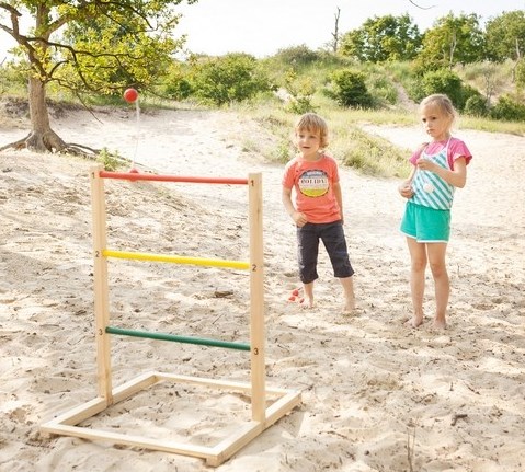 Stil stigen op udenfor og lav en linje i passende afstand derfra, sådan omkring 2 meter og opefter, alt efter hvilken aldersgruppe der skal spille.Man står bag linjen og kaster på skift sine tre snore med golfkugler, og alt efter på hvilken pind snoren langer, får man det point der står i siden.Hos en af vores søde legetanter går der rigtig hurtig konkurrence i den til børnefødselsdage, familietræf eller når man bare skal hygge sammen og være aktive, og samtidig er det super til træning af hånd/øje koordination.Mål på stige er 75 x 55 cmIndeholder: Stige2 x 3 snore med kugler af træ.